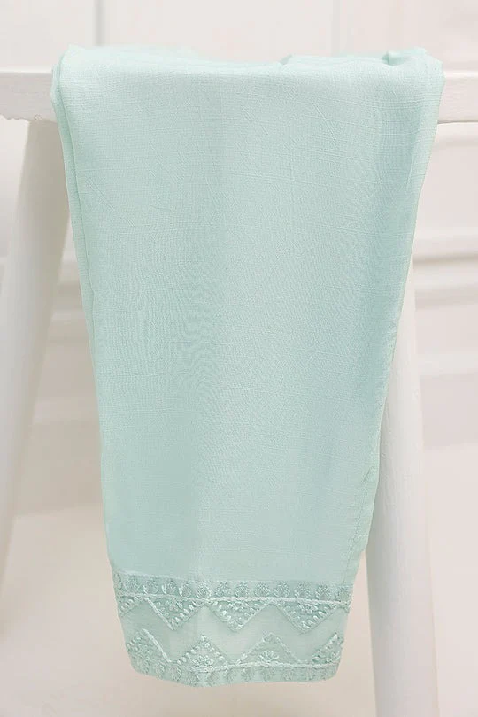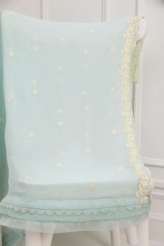 All laces used for finishing of the stitched outfit especially the dupatta or trousers may vary from the shoot.
