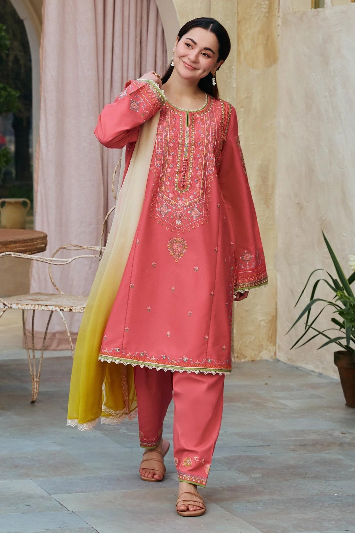 All laces used for finishing of the stitched outfit especially the dupatta or trousers may vary from the shoot.